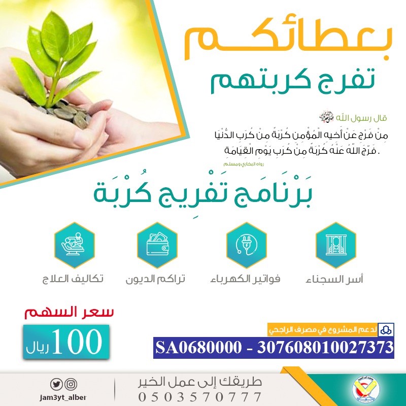 مشروع تفريج كرب هو مبادرة خيرية دفعت بها جمعية البر الخيرية بمحافظة قرية العليا، وتهدف إلى مساعدة الأسر والأفراد الذين يمرون بضائقة مالية أو اجتماعية كبيرة، وتخفيف معاناتهم من خلال تقديم الدعم اللازم، ويركز المشروع على تسديد الديون، وتوفير الاحتياجات الأساسية، والمساهمة في حل المشكلات العاجلة مثل العلاج أو الإيجار المتأخر