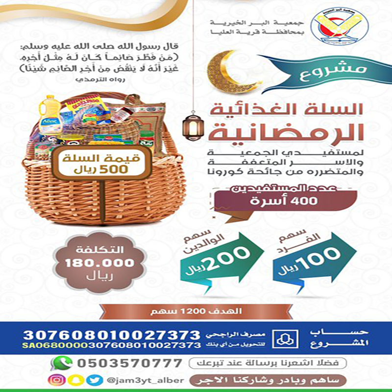 من هنا انطلقت جمعيتنا بمشروع السلال الغذائية، وهو مبادرة إنسانية تهدف إلى توفير احتياجات الغذاء الأساسية للأسر المحتاجة، حيث يعمل المشروع على دعم الأمن الغذائي وتخفيف معاناة الفئات الأكثر ضعفًا من خلال توفير المواد الغذائية الأساسية بشكل دوري.