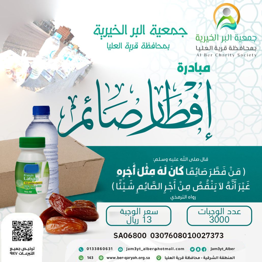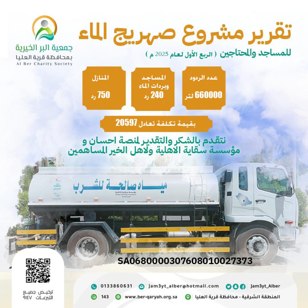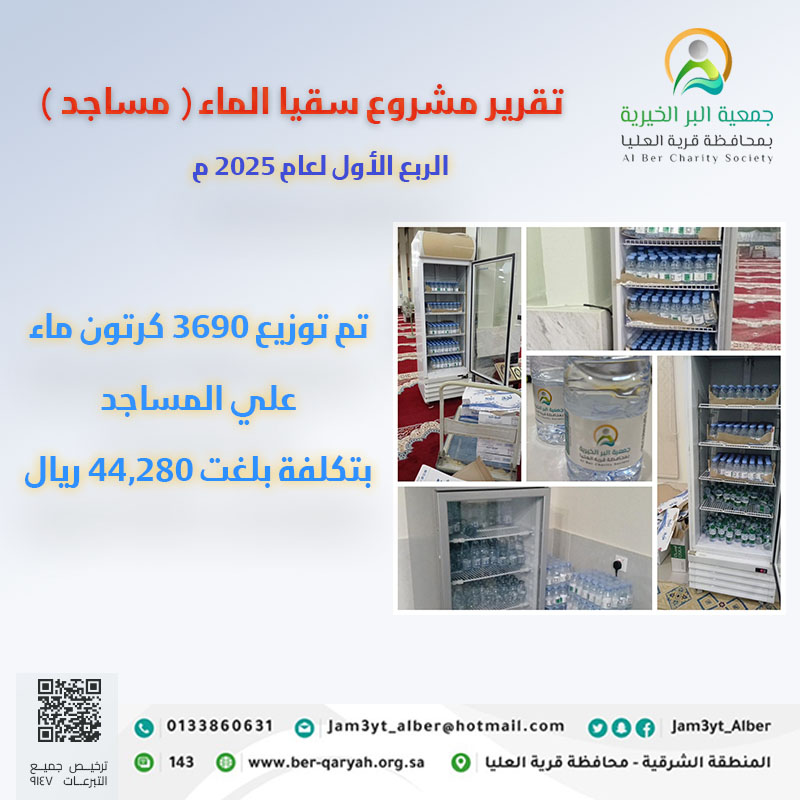 وانطلاقاً من عِظم أجر السقيا بادرت جمعية البر الخيرية بمحافظة قرية العليا بمشروع سقيا الماء بالمساجد، وهومبادرة تهدف إلى توفير مياه الشرب النقية للمصلين ورواد المساجد، حيث أن المشروع يسعى إلى ضمان توفير المياه بشكل مستدام في دور العبادة، مما يعكس أهمية التكافل الاجتماعي والاهتمام بالخدمات العامة.
