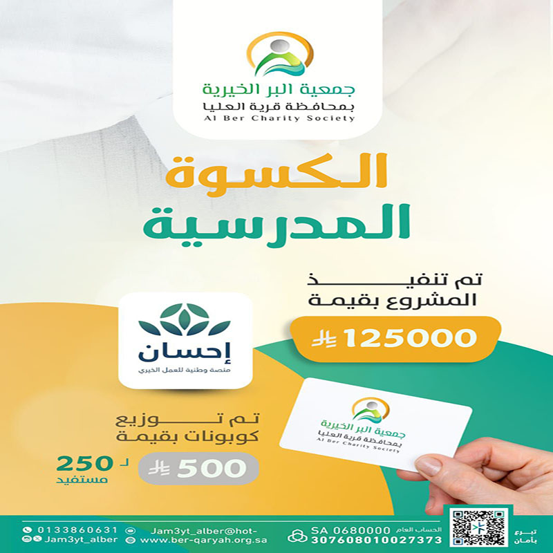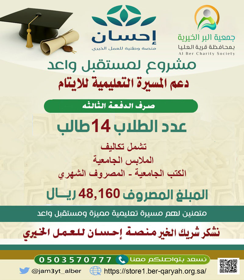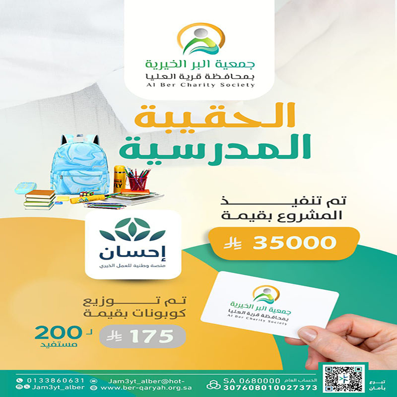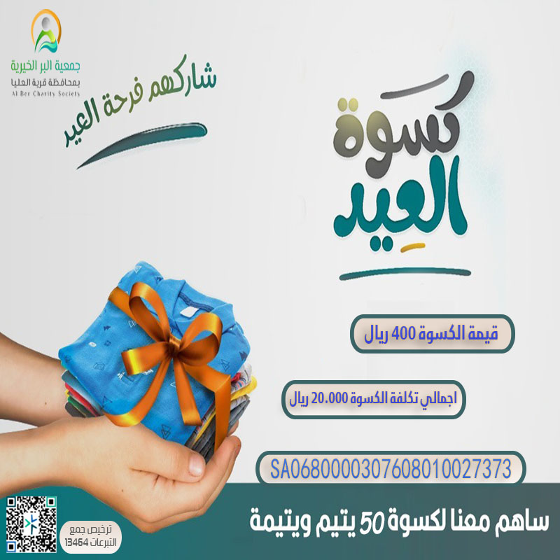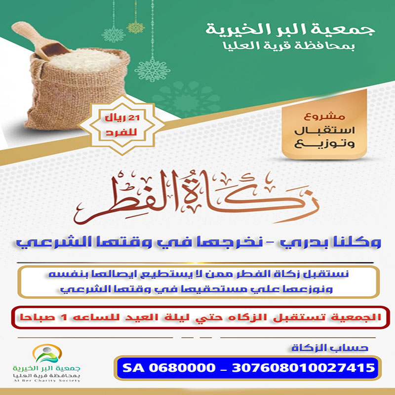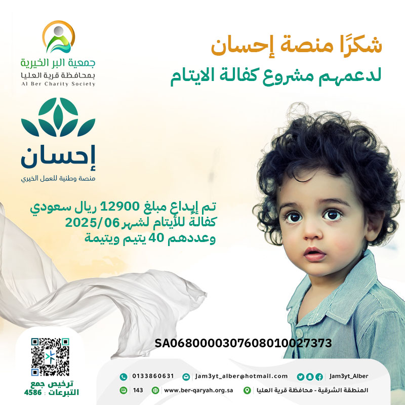 ومن منطلق الإصلاح ودعم الأيتام بادرت جمعية البر الخيرية بمحافظة قرية العليا بمشروع كفالة الأيتام، وهو مشروع إنساني هدف إلى تقديم الدعم المادي والمعنوي للأطفال الذين فقدوا أحد الوالدين أو كلاهما، والهدف الرئيسي هو توفير بيئة آمنة ومستقرة للأيتام تساعدهم على بناء مستقبل أفضل وتحقيق الاكتفاء الذاتي، حيث يتم صرف مبلغ شهري للأيتام؛ لإعانتهم على ظروف الحياة.